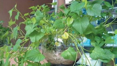 今天将告诉您地瓜水植全程,解说之前先来观赏一下地瓜水植盆景吧,你是不是惊呆了!你没看错,这不是爬山虎,这是地瓜。