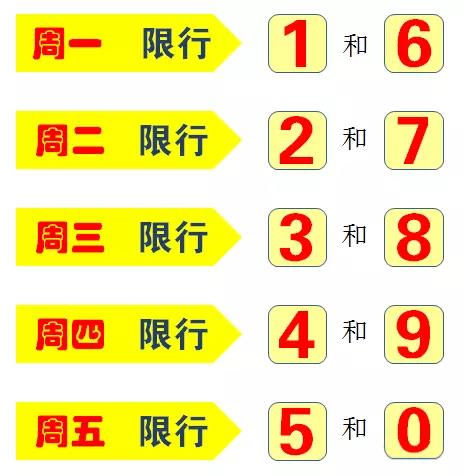 (一)按机动车号牌(含临时号牌和外地号牌)蕞后一位阿拉伯数字(尾数为字母的,以末位数字为准),工作日每天限行两个号。