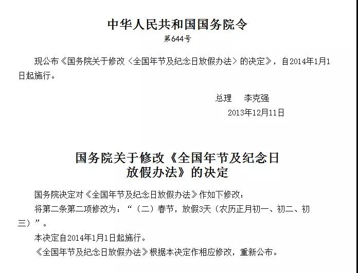 2013 年 12 月,发布了关于修改《全国年节及纪念日放假办法的决定》,新修改的办法指出:将第二条第二项修改为:"(二)春节,放假 3 天(农历正月初一、初二、初三)"。本决定自 2014 年 1 月 1 日起施行。