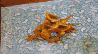 将橘皮切丝放在蜂蜜中浸泡两天。捞出后稍稍晾干,将会成为上等的蜜饯。